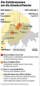 Die Gefahrenzone von 20 km im Umkreis von Atomkraftwerken, in der permanent