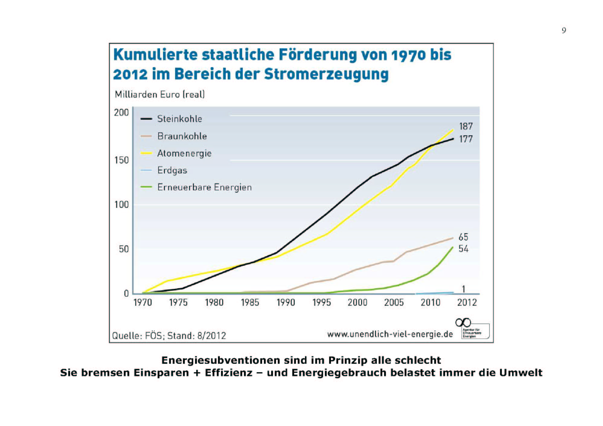3.  Lüge:   Allein der Ökostrom wird stark subventioniert. Die Wahrheit ist, dass seit dem Jahr 2000 die Einspeise-Vergütung für das EEG 60 Milliarden Euro betrug, aber Kohle- und Atomenergie seit vielen Jahrzehnten mit insgesamt über 400 Milliarden Euro an staatlichen Subventionen unterstützt wurden.
